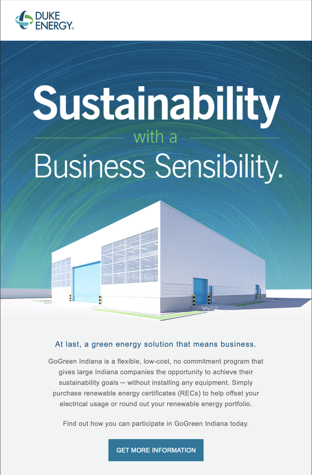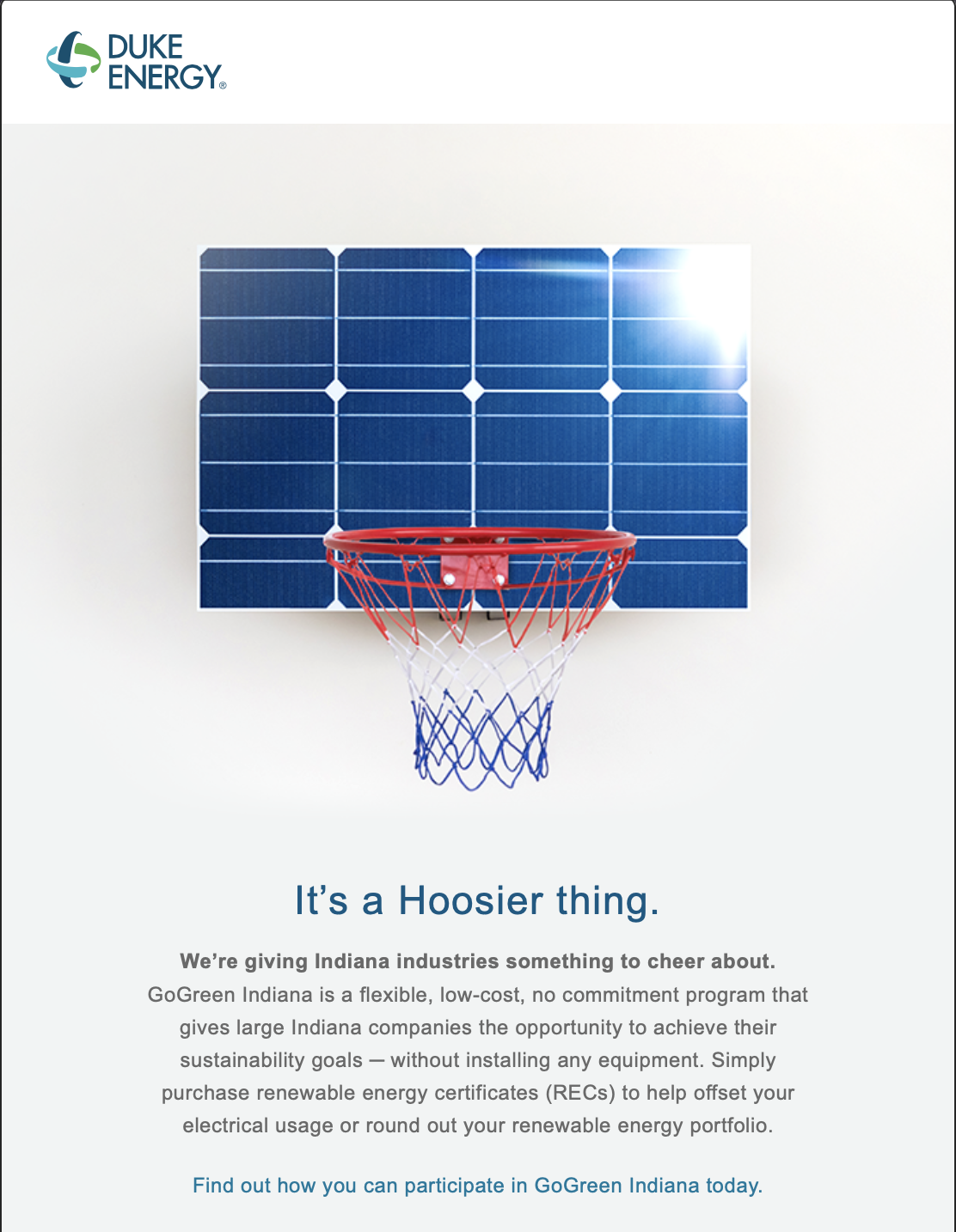 As Senior Copywriter and Marketing Strategist at Duke Energy, one of the nation's largest energy utility companies, I developed marketing content and campaign strategy for consumer-facing and enterprise sustainability and renewable energy programs. My work focused on translating complex energy technology, grid infrastructure, and policy information into clear, persuasive messaging that drove customer acquisition and enrollment among individuals, small businesses, and industrial companies.